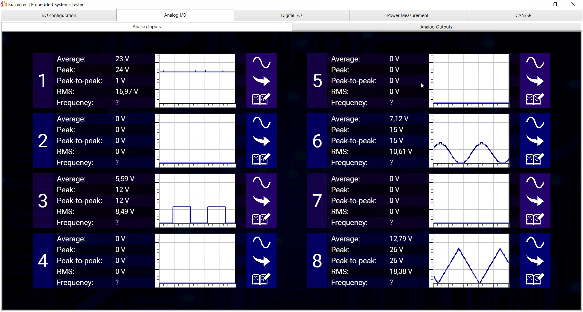 | Aplicação para Windows (2/7) | Leitura dos sinais nas entradas analógicas, com vista de osciloscópio: |