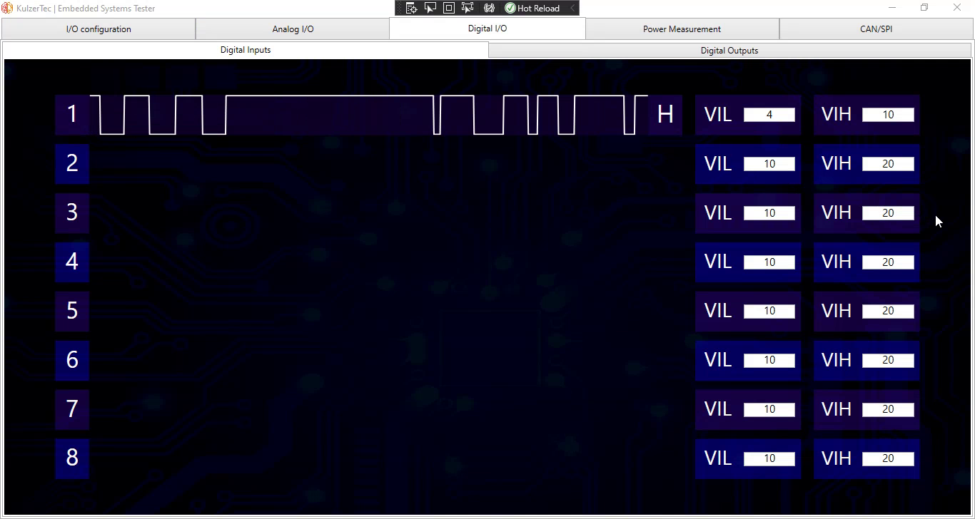 | Aplicação para Windows (4/7) | Leitura dos sinais nas entradas digitais, com deteção de nível lógico: |
